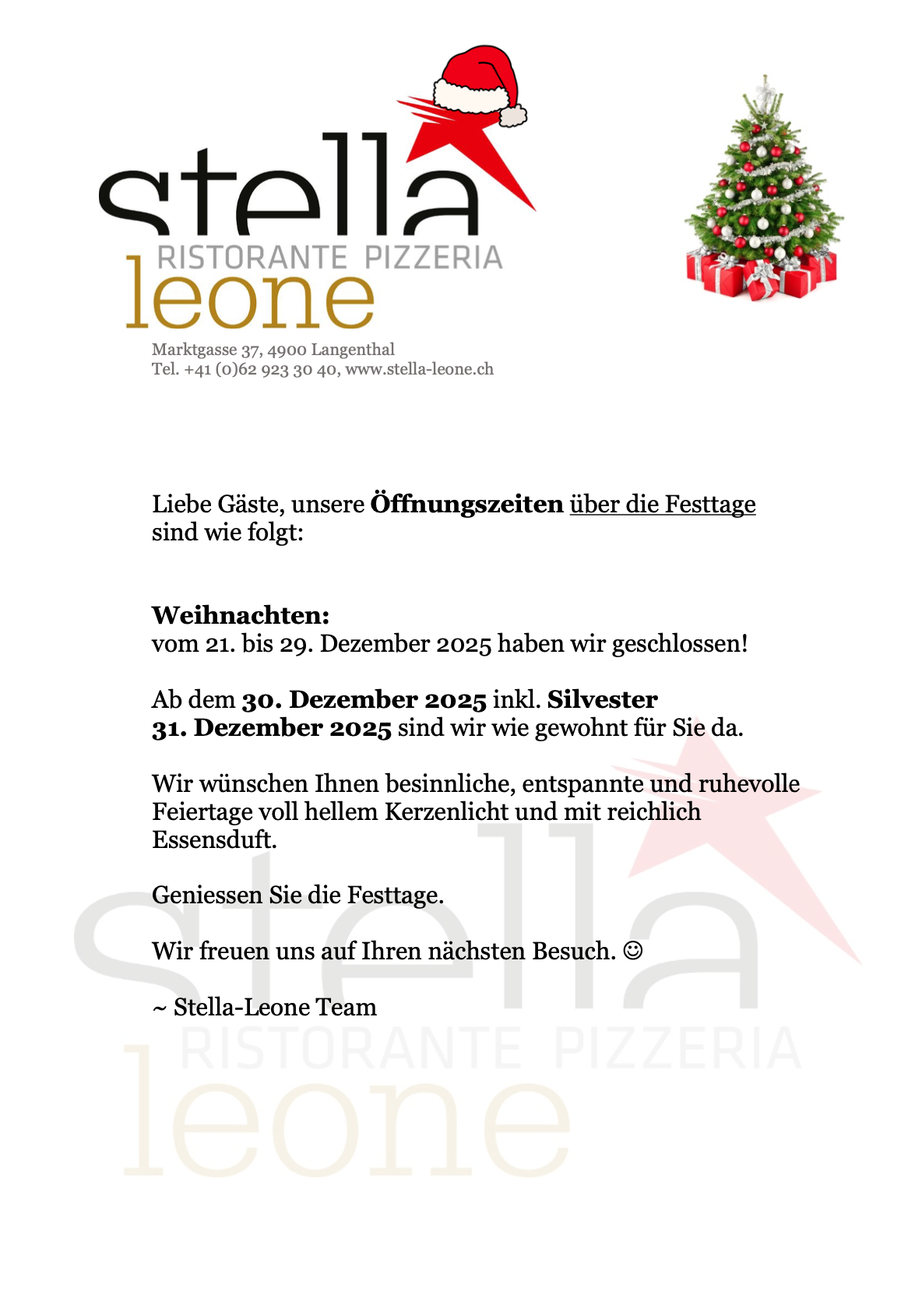 Wir begrüssen Sie bei Ristorante Pizzeria Stella Leone.